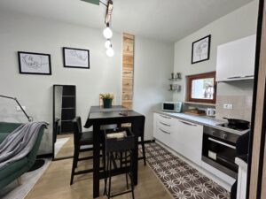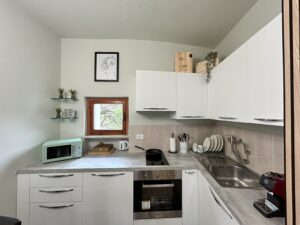 This is a small and comfortable design accommodation, perfect for a couple or a small family. It has a fully equipped kitchenette and a bathroom.